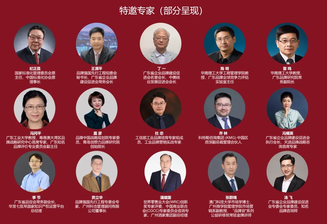 2024品牌强国创新论坛群英荟萃,省内外品牌权威专家嘉宾及企业品牌大咖重磅出席,隆重邀请了国家标准化管理委员会原主任、中国标准化协会原理事长纪正昆先生作为特邀贵宾出席,作新质生产力时代下质量强国相关主题报告;品牌强国先行工程组委会秘书长、广东省企业品牌建设促进会常务会长王满平作共建广东品牌全球竞争力实验室介绍;特别邀请到广东省企业品牌建设促进会名誉会长、中美硅谷发展促进会会长丁一,工信部品牌培育专家组核心成员、华南理工大学工商管理学院教授、广东品牌全球竞争力评估实验室主任陈明,华南理工大学教授、广东品牌研究院常务副院长雷鸣,广东工业大学教授、粤港澳大湾区品牌战略研究中心首席专家、广东知名品牌评价专业委员会副主任冯冈平,品牌中国战略规划院专家委员、青岛创想力品牌研究院创始院长盖彦,工信部工业品牌培育专家组成员、工业品牌营销实战专家杜忠,科特勒咨询集团 (KMG) 中国区资深副总裁管理合伙人乔林,广东省企业品牌建设促进会执行会长、天进品牌战略咨询首席专家冯帼英,广东省品促会常务副会长、华发七弦琴国家知识产权运营平台总经理季节,品牌强国先行工程专委会专家、广州科也管理顾问有限公司董事长贡立华,世界零售业大会(WRC)创新奖专家评委、中国商业联合会(CGCC)专家委员会咨询专家、广州酒家集团副总经理潘建国,澳门科技大学市场学博士、广州商学院管理学院市场营销系副教授、“品牌官"系列公益研修班常驻金牌讲师张蔚鴒,广东省企业品牌建设促进会专委会专家委员、知名品牌咨询师汤飞等权威专家、行业大咖做专题报告、主题分享与高峰对话,充分发挥品牌引领作用,激发企业创新创造活力,弘扬企业家创新精神,锻造品牌全球竞争力,打造更多中国世界级品牌!